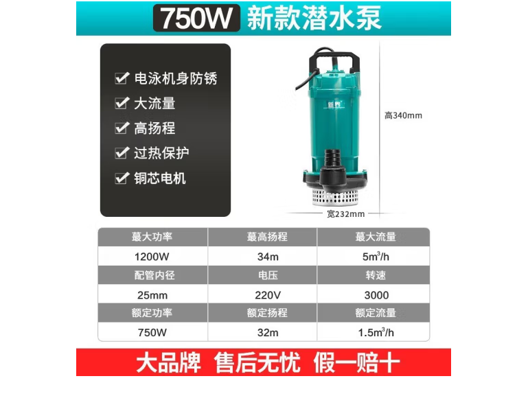 ¥324.00新界潛水泵家用水泵高揚程抽水泵農(nóng)用灌溉噴灌泵抽水機(jī)水井水塔清水泵增壓泵220V 750W/一寸潛水泵