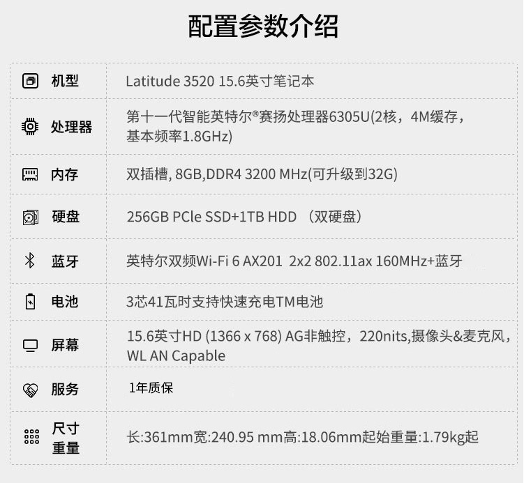 戴爾(DELL) Latitude智銳3520 15.6英寸筆記本電腦 超薄商務(wù)學(xué)生便攜本 定制:C6305U/8G/1T/256G固態(tài) 一年保修