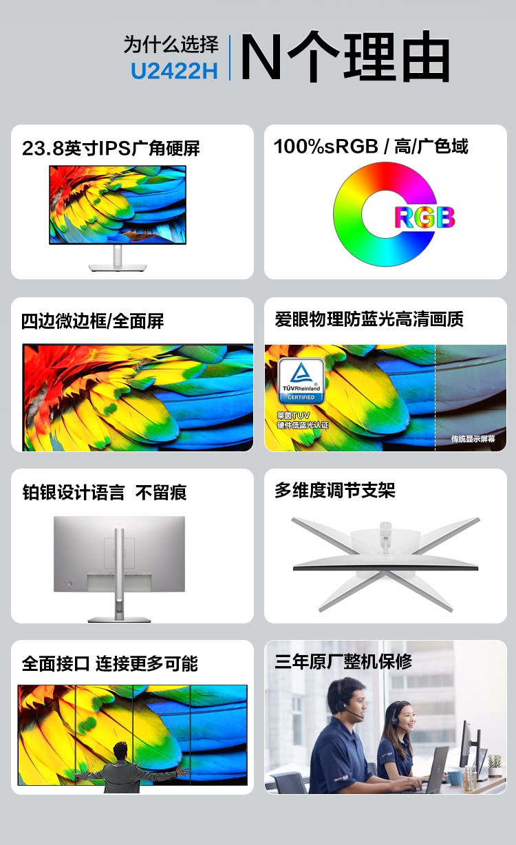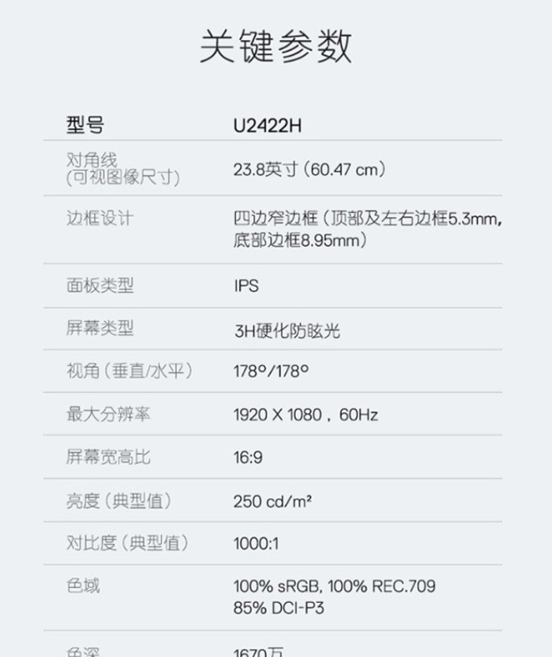 戴爾(DELL) U2422H 23.8英寸顯示器(HDMI+DP接口)U2419升級